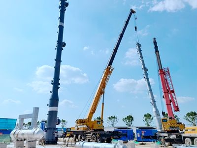 據(jù)悉,此次吊裝吸收塔和再生塔是本項目脫酸單元的核心設(shè)備,為確保本次吊裝的平穩(wěn)有序推進,項目組積極與咸陽禮泉縣道路運輸管理部門、供貨商、施工方等各方對接,確定了發(fā)貨時間、運輸路徑,并嚴(yán)格篩查相關(guān)人員行程軌跡,確保吸收塔和再生塔的順利進場。隨后及時進行設(shè)備驗收,同時督促施工方制定并優(yōu)化吊裝方案,確保吊裝機具到位,將吸收塔和再生塔成功吊裝到位。