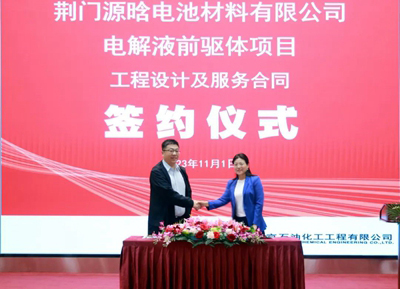 11月1日,荊門源晗電池材料有限公司(簡稱:荊門源晗)電解液前驅體項目工程設計及服務合同簽約儀式在北京石油化工工程有限公司(簡稱:北油工程)舉行。荊門源晗公司總經理周虎,北油工程公司黨委副書記、總經理田偉代表雙方簽署協議。