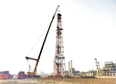 據悉,該火炬高80米,總重100噸,分三段在地面組裝后依次進行吊裝。為確保吊裝工作的順利進行,項目部組織業(yè)主、監(jiān)理、承包商對火炬組裝的質量及組裝臨時平臺的搭設情況進行全方位檢查,吊裝過程中,項目人員嚴格按照操作規(guī)程執(zhí)行,確保吊裝作業(yè)的安全、平穩(wěn)。目前,施工人員正加緊配套地面火炬管廊、附屬設備等相關工作,加班加點確保火炬按期投用。